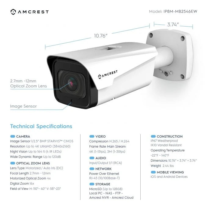 Amcrest 4K Optical Zoom IP PoE Bullet Camera, IP67 White IP8M-MB2546EW